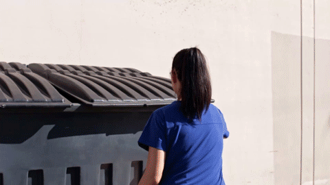 Manage the dumpster lid with one hand.